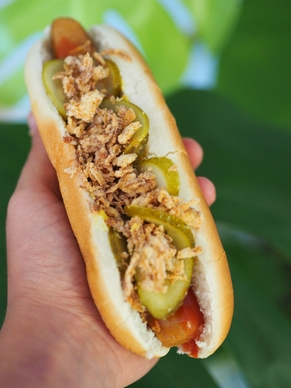 Die Hot Dog-Brötchen im Backofen (200 Grad Ober-/Unterhitze, ca. 5 Minuten) oder über dem Feuer erwärmen. Währenddessen die veganen Würstchen in heißem Wasser erhitzen. Anschließend legt ihr die Würstchen in die Brötchen, gebt Senf und Ketchup drüber und belegt nach Lust und Laune mit Gurken und Röstzwiebeln.