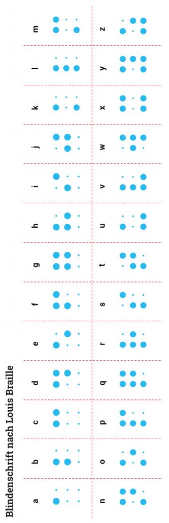 Verbindet euch die Augen, versucht ein Glas einzuschenken oder euch im Gruppenraum zurechtzufinden, verschiedene Alltagssituationen können eine besondere Herausforderung darstellen. Ihr könnt auch eine Nachricht in Braille-Schrift verfassen und die dann gemeinsam „entschlüsseln“. Am Ende könnt ihr in der Gruppe darüber sprechen, welche Probleme sich ergeben haben und wir ihr diese bewältigt habt. Was wären besondere Herausforderungen auf Fahrt und Lager?