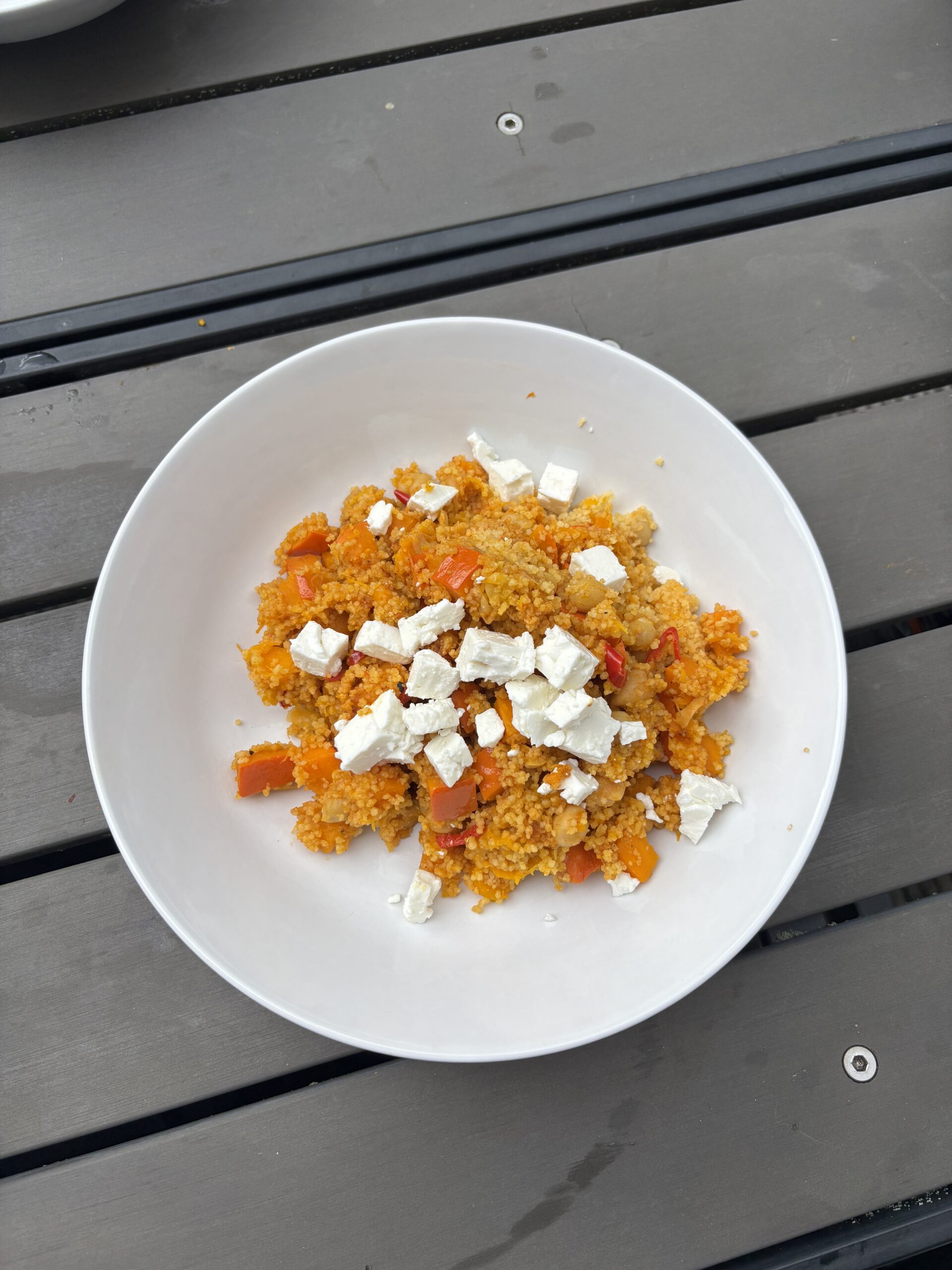 Zuerst wird der Kürbis in kleine Würfel geschnitten – je kleiner, desto schneller gart er. In einem Topf wird etwas Öl erhitzt und der Kürbis darin für etwa 10 Minuten angebraten, bis er leicht braun wird. Anschließend gibt man die Kichererbsen dazu (abgetropft, wenn sie aus der Dose stammen) und brät sie für weitere 1–2 Minuten mit, sodass sie Röstaromen entwickeln. Jetzt wird gewürzt: Paprikapulver, Kreuzkümmel, Zimt (nach Belieben), Salz, Pfeffer und eventuell etwas Chili kommen dazu und werden kurz mit angeröstet. Danach wird der trockene Couscous untergemischt und gründlich mit dem Gemüse vermengt. Nun gießt man etwa 150–200 ml heißes Wasser hinzu, rührt gut um und setzt den Deckel auf. Der Topf wird vom Feuer genommen, damit der Couscous für etwa 5 Minuten quellen kann. Zum Schluss wird Feta zerbröselt und untergemischt. Mit geschlossenem Deckel lässt man das Gericht noch 1–2 Minuten ziehen – fertig!