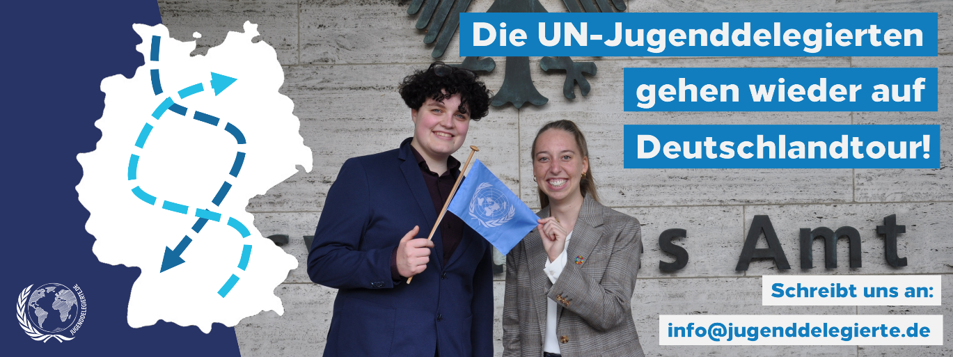 Wir, Ilka Essig und Lew Töpfer, sind die diesjährigen Jugenddelegierten zur Generalversammlung der Vereinten Nationen. Während unserer einjährigen Amtszeit setzen wir uns dafür ein, das junge Menschen mehr in internationale Entscheidungsprozesse eingebunden werden und sprechen mit deutschen Jugendlichen über ihre Partizipationsmöglichkeiten in den Vereinten Nationen. Das Programm wird vom DNK (Deutsches Nationalkomitee für internationale Jugendarbeit) und der DGVN (Deutsche Gesellschaft für die Vereinten Nationen e.V.) getragen.