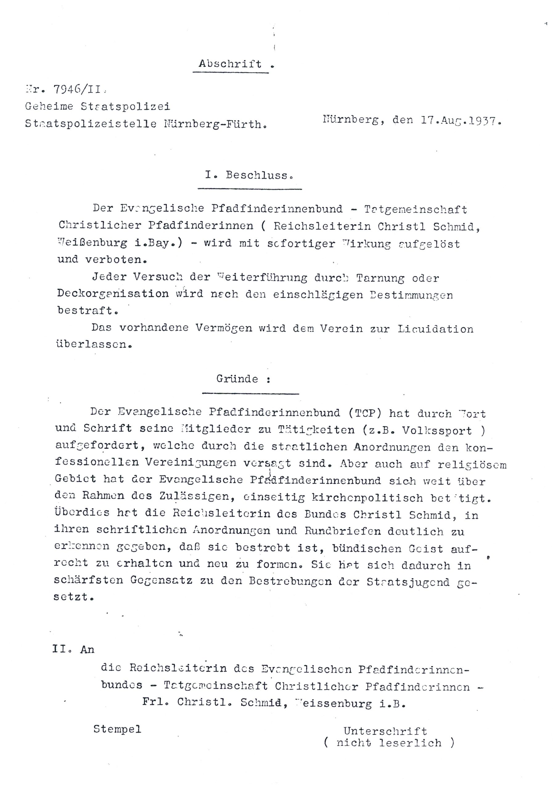 Die größten interkonfessionellen Pfadfinderbünde hatten sich noch im März 1933 zum „Großdeutschen Bund“ zusammengeschlossen und zum Nationalsozialismus bekannt, um durch ihre Größe und die öffentlich bekundete Linientreue einem Verbot zu entgehen. Das hat aber nichts gebracht, der Großdeutsche Bund wurde im Juni 1933 verboten. Die evangelischen Pfadfinder*innenbünde mussten alle ihre Mitglieder unter 18 Jahren an die Hitlerjugend abgeben. Von den größeren Bünden durfte nur die katholische DPSG noch bis 1938 weitermachen, aber auch ihre Gruppen waren immer stärkerer Repression ausgesetzt.